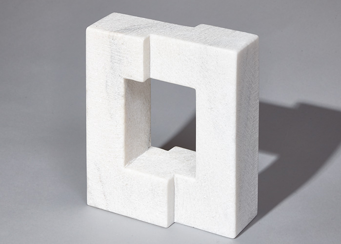 “In meiner Werkstatt liegt ein Stück portugiesischer Marmor, Rosa Aurora, von beeindruckender Farbe und Zeichnung. Ich teile diesen Stein in zehn gleiche Stücke und beginne, zehnmal die gleiche Form herauszuarbeiten. Versetzte Flächen und ein Durchbruch lassen diese Skulptur das Licht einfangen.